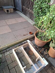 Hedgy’s home & cat-proof feeding station.